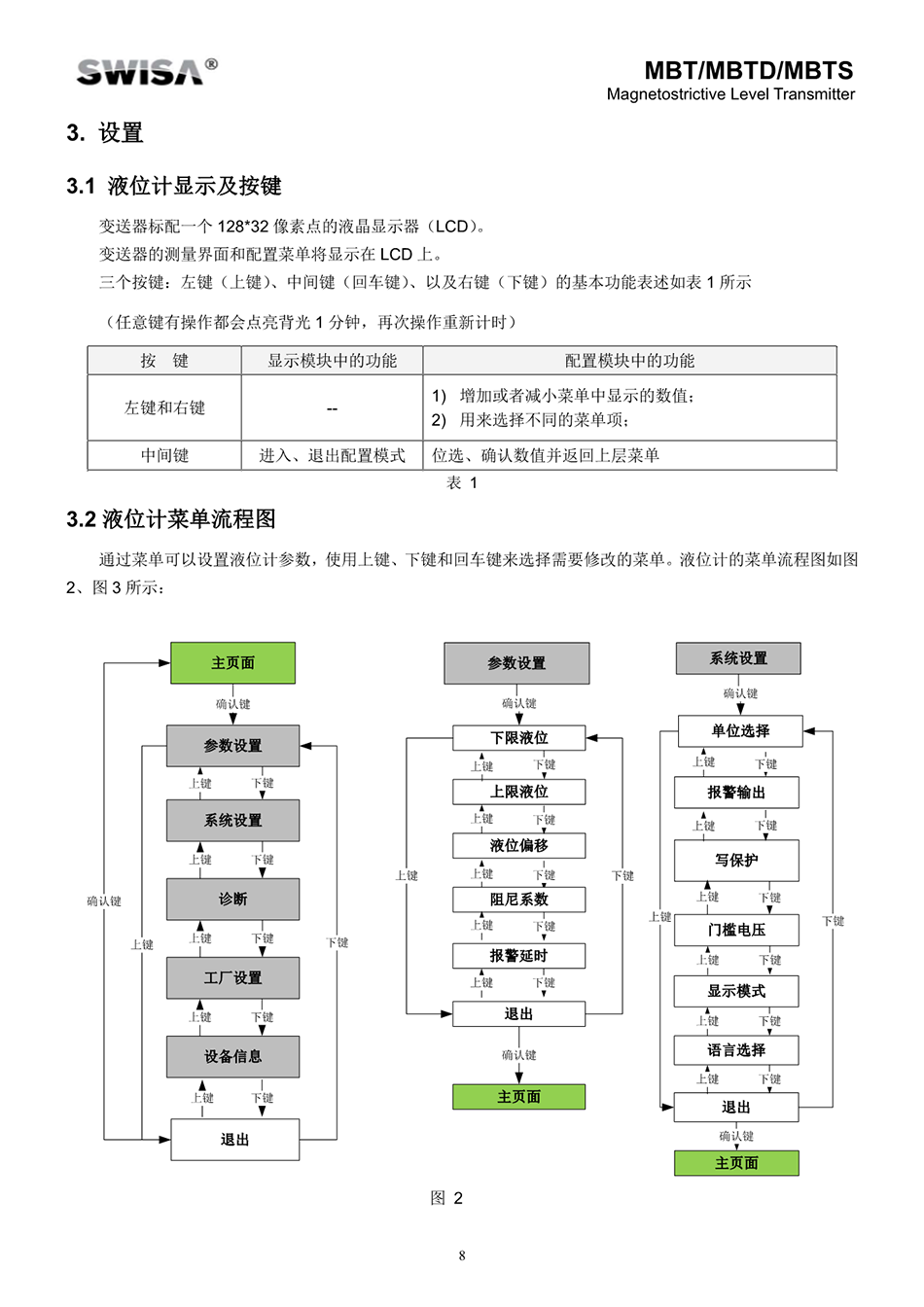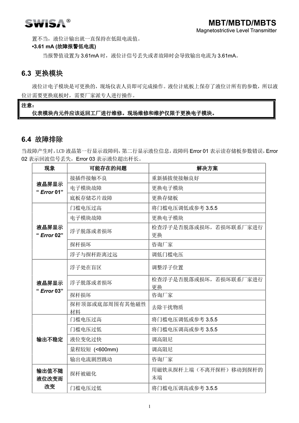 SWISA的新單腔磁致伸縮液位計(以下簡稱液位計)是具有品質(zhì)的產(chǎn)品。液位計具有高精度、低維護的優(yōu)點,可以在0~5MPa、0℃~149℃的工況中正常運行。它采用HART協(xié)議通訊,可以與大部分?jǐn)?shù)字化控制系統(tǒng)進行通訊。LCD顯示屏可以提供三種顯示值:4~20mA電流、液位百分比及液位值